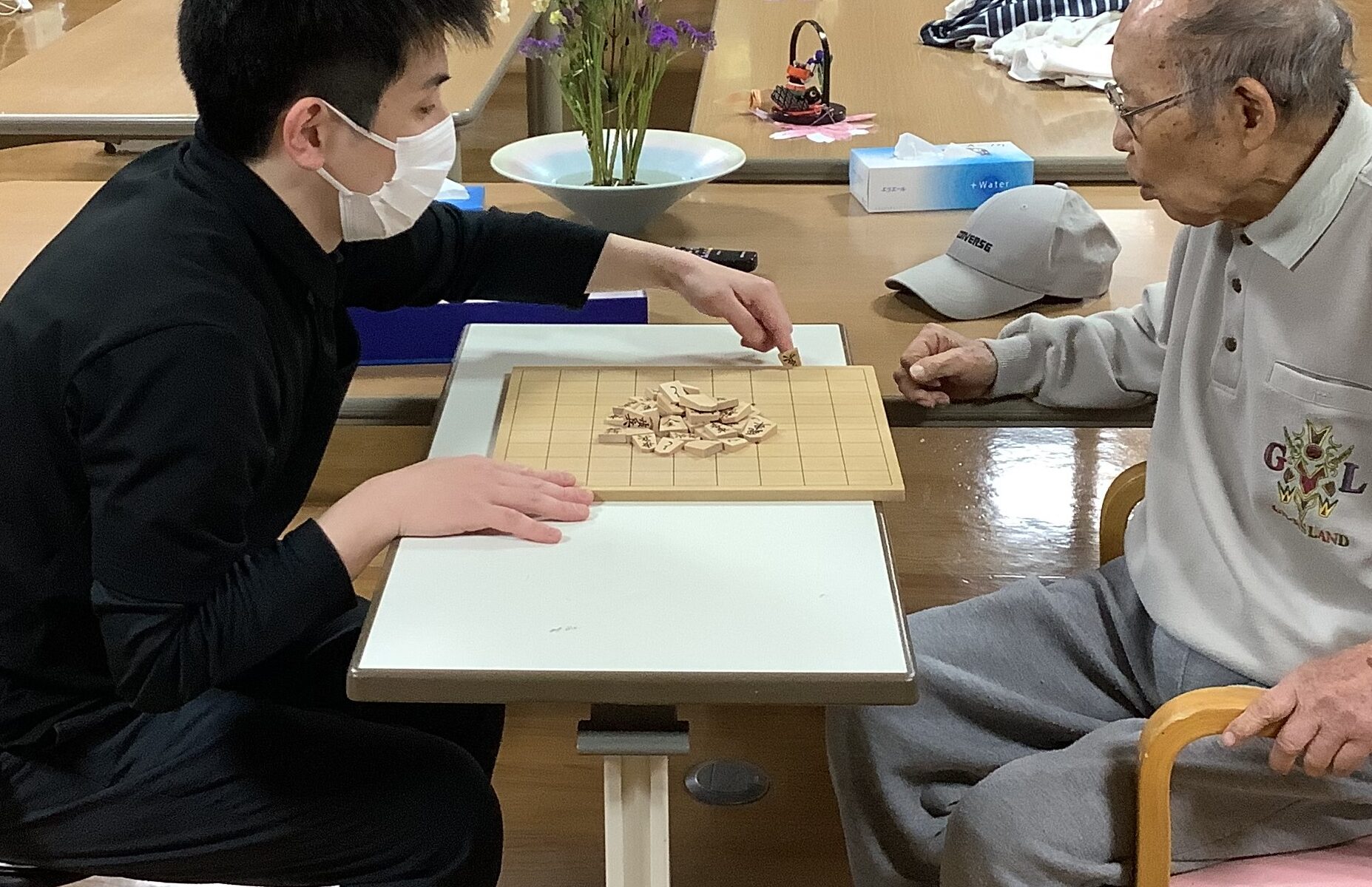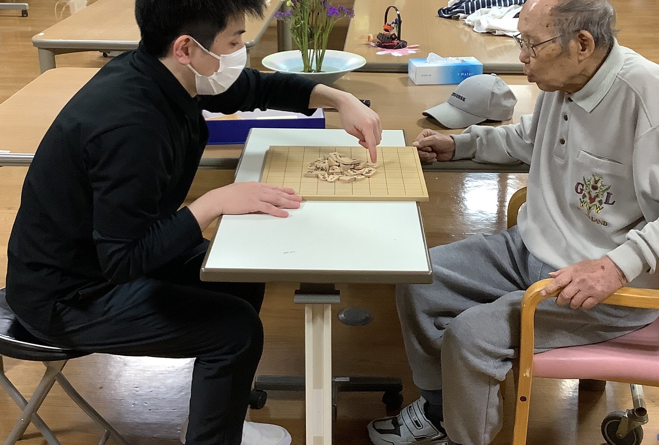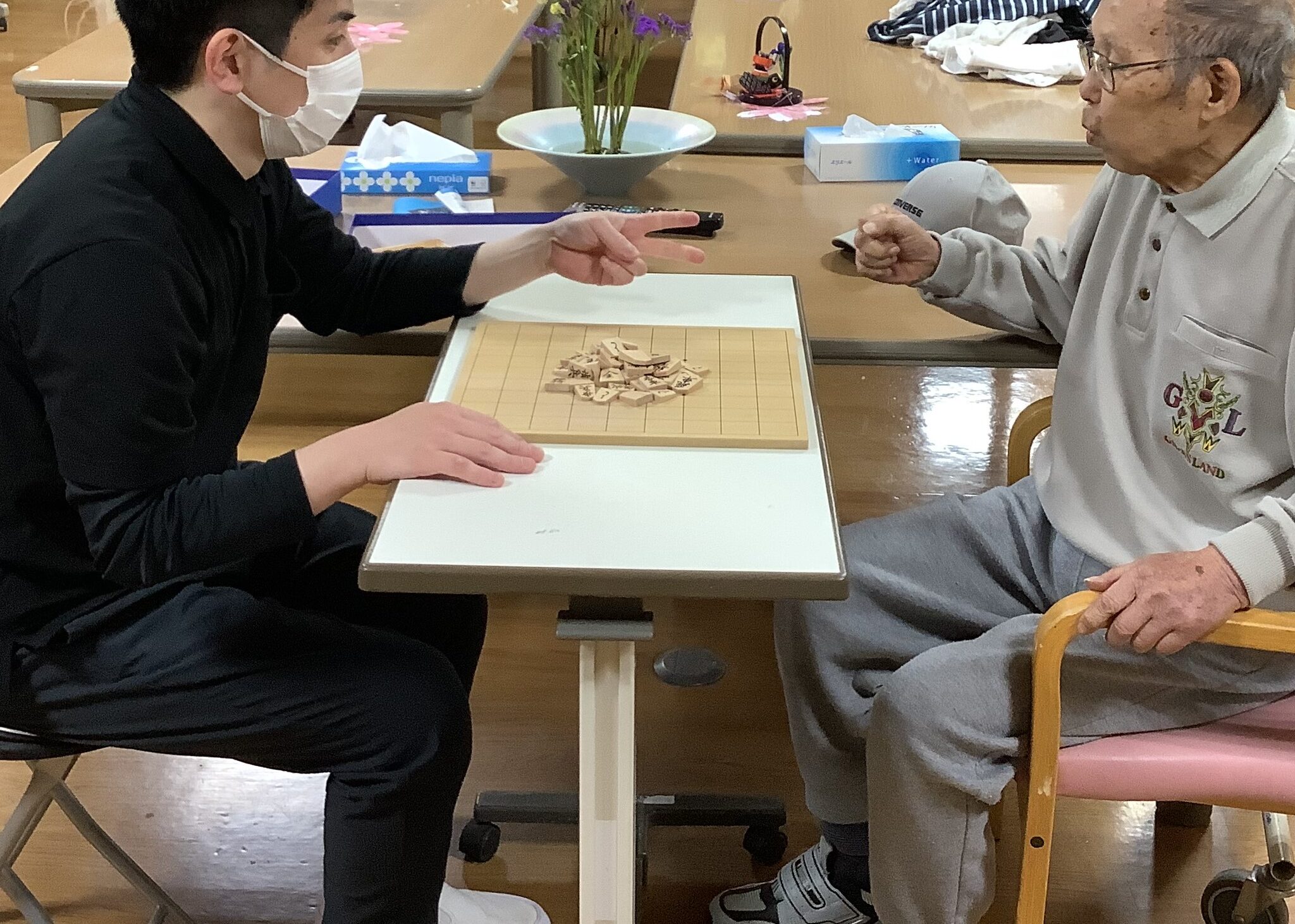 ご利用者様と将棋倒しで真剣勝負しました。