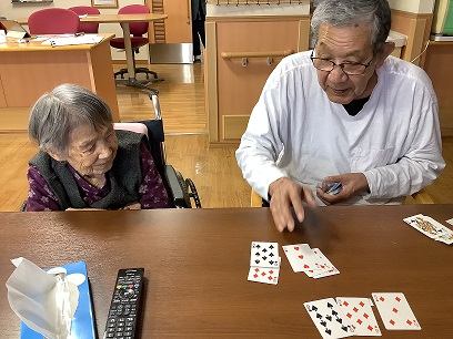 トランプが得意な入居者様が、もう一人の方にルールを教えながら楽しまれています。