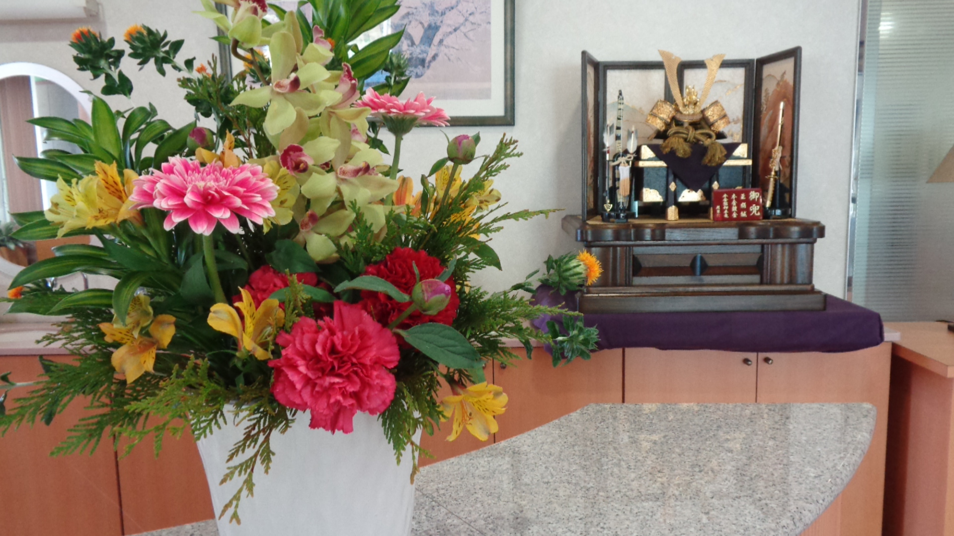 今週のお花と御兜です
